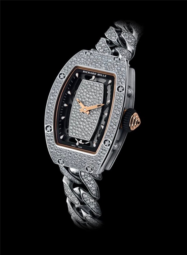 ●RM07-01白金雪花镶嵌链环款:这款珠宝腕表采用雪花镶嵌工艺,搭配与白金表壳线条延伸的链环式镶钻表链,并以红金细节增添层次。